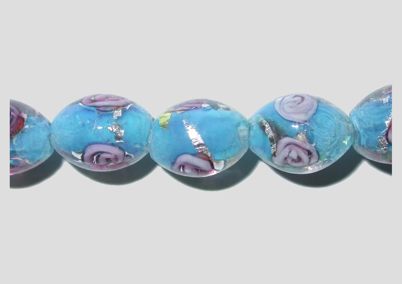 10 x 8mm Floral Oval – 18cm Strand. Approx 10 x 8mm size. Oval Shaped Glass Bead. Floral pattern with foil stripes. Please contact us to purchase individual pieces.