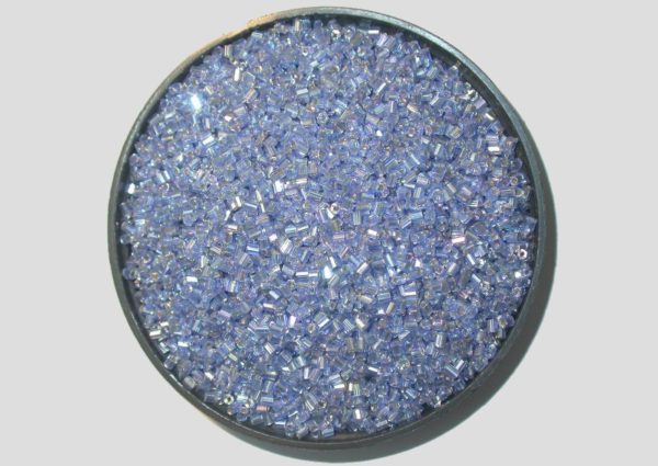 11/0 Bugle – Lt Blue SL AB – Price per gram. Hex Cut. Approx 2 x 2mm in size. Glass beads. Silverlined AB colours / 1 side rainbow coated. Please contact us to purchase colours not displayed.