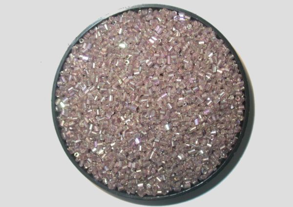 11/0 Bugle – Lt Purple SL AB – Price per gram. Hex Cut. Approx 2 x 2mm in size. Glass beads. Silverlined AB colours / 1 side rainbow coated. Please contact us to purchase colours not displayed.