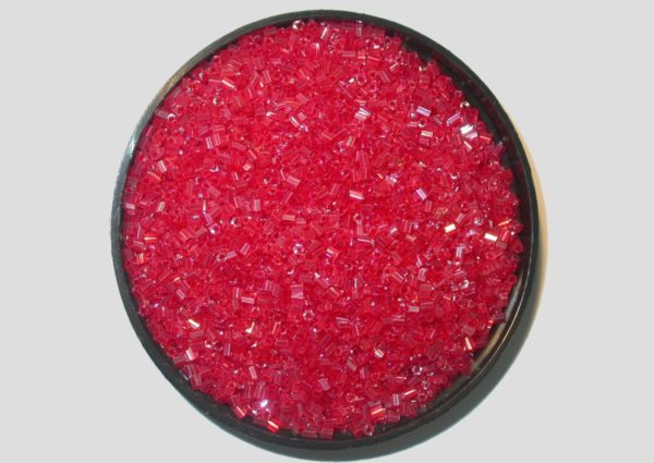 11/0 Bugle – Red Luster – Price per gram. Hex Cut. Approx 2 x 2mm in size. Glass beads. Luster colours / one side luster coated. Please contact us to purchase colours not displayed.
