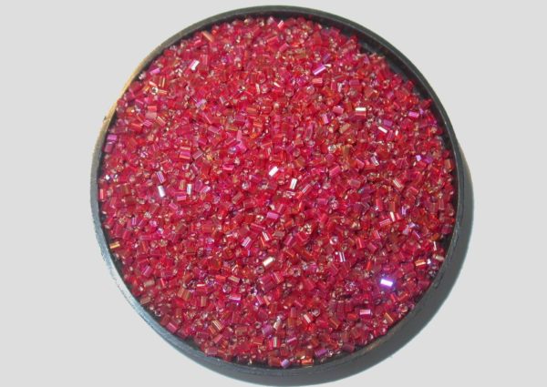 11/0 Bugle – Red SL AB – Price per gram. Hex Cut. Approx 2 x 2mm in size. Glass beads. Silverlined AB colours / 1 side rainbow coated. Please contact us to purchase colours not displayed.