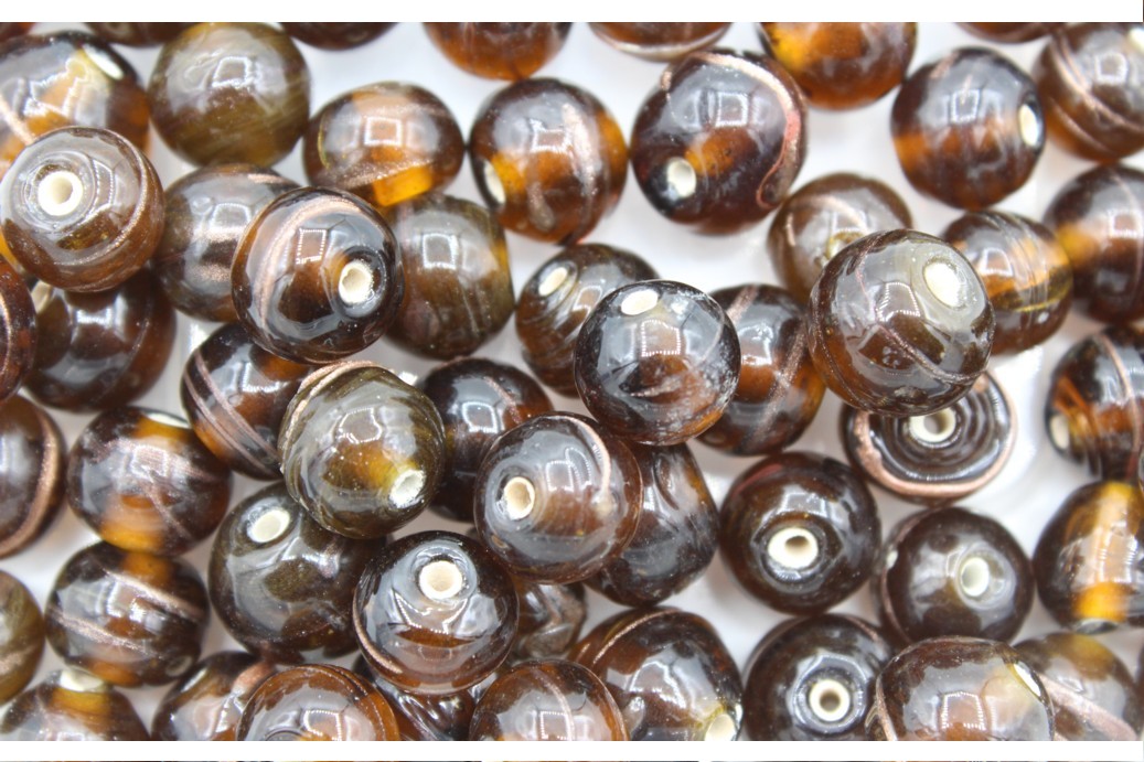 12mm Round – Brown With Gold Swirl. Glass Bead. Made in India.