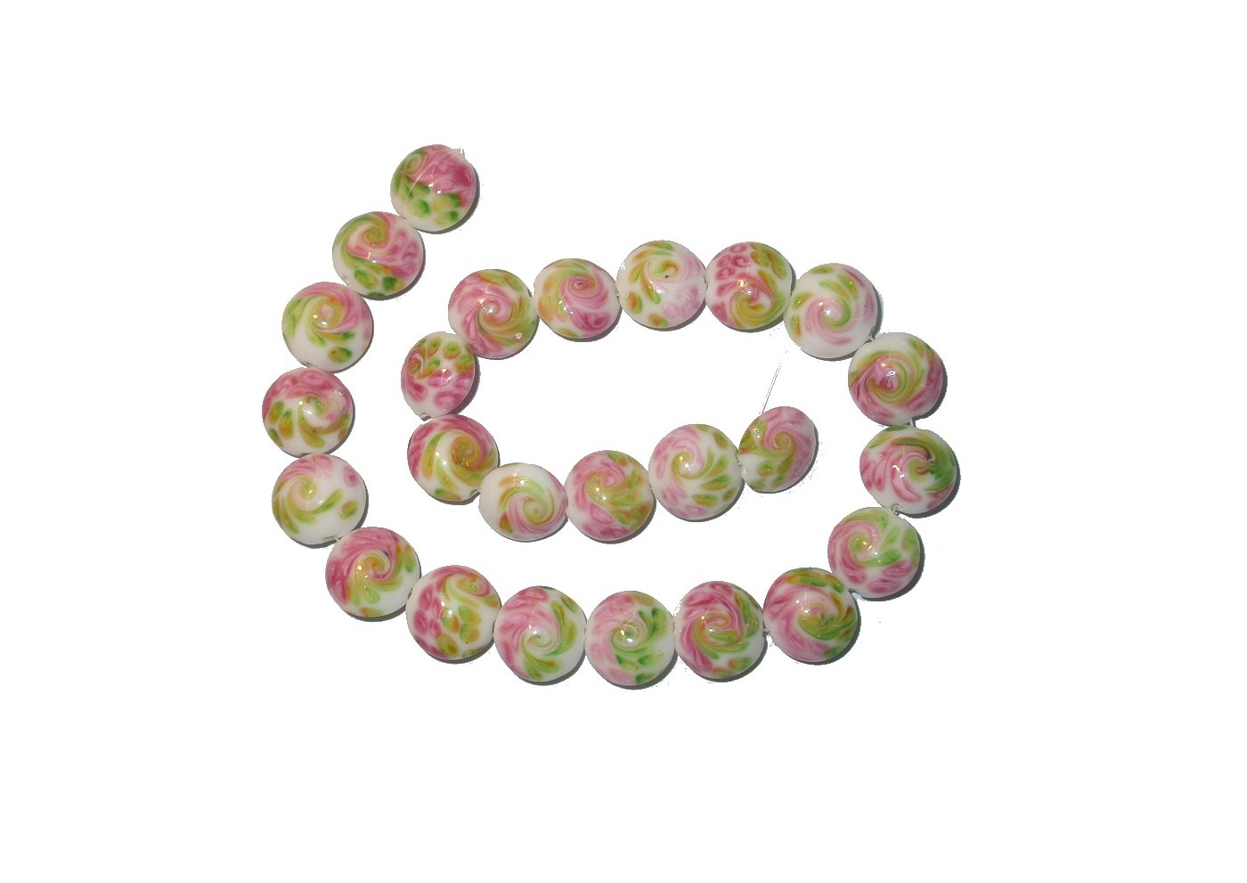 15mm Flat Sphere Floral Design. 38cm Strand. Glass beads.