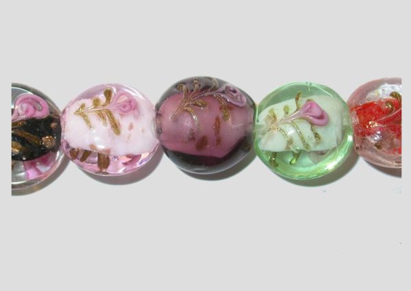 15mm Floral Coin – Mixed Colour – 37cm Strand. Please contact us to purchase individual pieces.