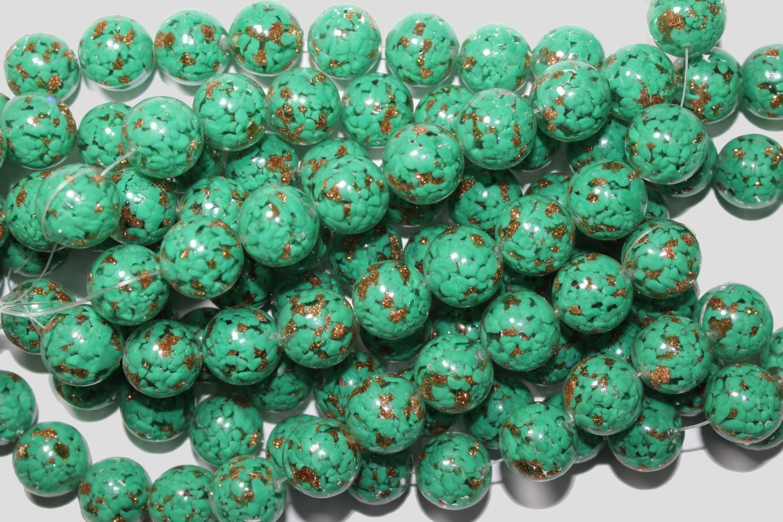 16mm Lampwork – Gold Foil – Green – 18cm Strand. Gold foil flakes. Glass bead. ‘A’ Quality. Please contact us to purchase individual pieces.