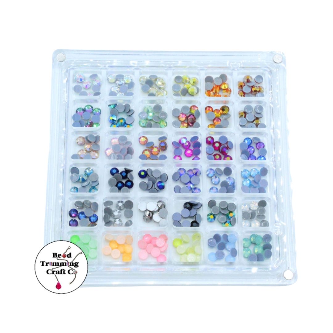 Introducing our Magnetic Display Box, featuring 36 vibrant AB, Opal, Neon & other fancy colors. This versatile display box not only showcases your crystals beautifully but also offers a convenient design: the back lid can be easily removed, allowing you to take out the crystals and try them on your costumes, fabrics & more effortlessly. Perfect for designers and hobbyists alike, this display box ensures you have a rainbow of options at your fingertips.