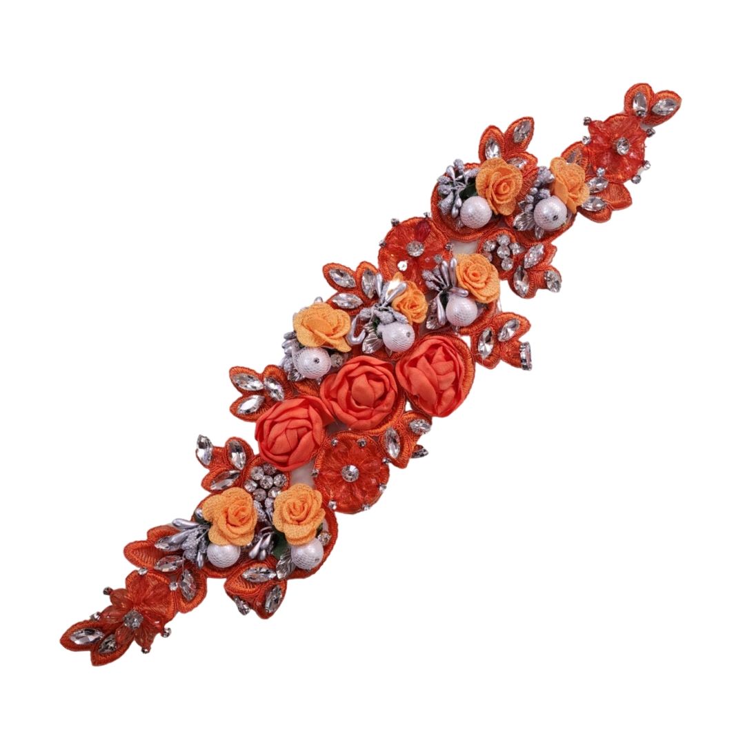 Motif – Combination of Round & Navette Crystals, Plastic Drops, Pearls & Ribbon & Organza Flowers.
