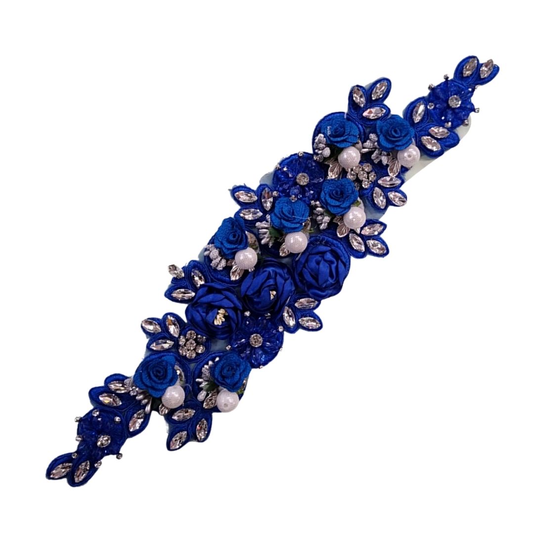 Motif – Combination of Round & Navette Crystals, Plastic Drops, Pearls & Ribbon & Organza Flowers.