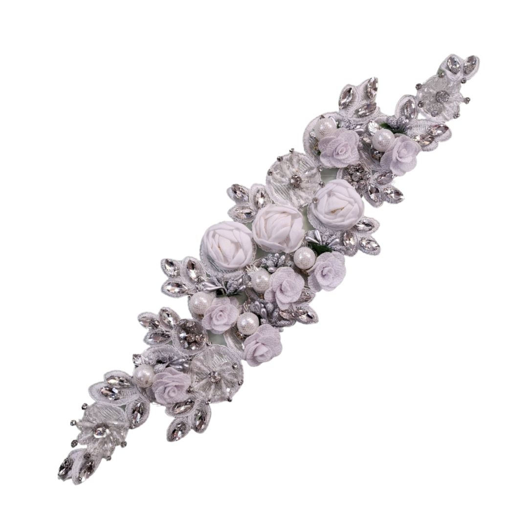 Motif – Combination of Round & Navette Crystals, Plastic Drops, Pearls & Ribbon & Organza Flowers.