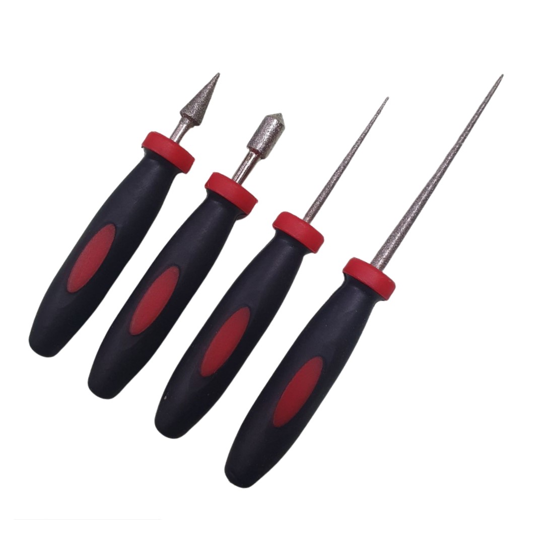 4 Piece Ergo Bead Reamer Set. Perfect for softening rough edges. Use to smooth and enlarge bead holes. 50 x 12mm Handle length. 7cm – 10cm tool length.