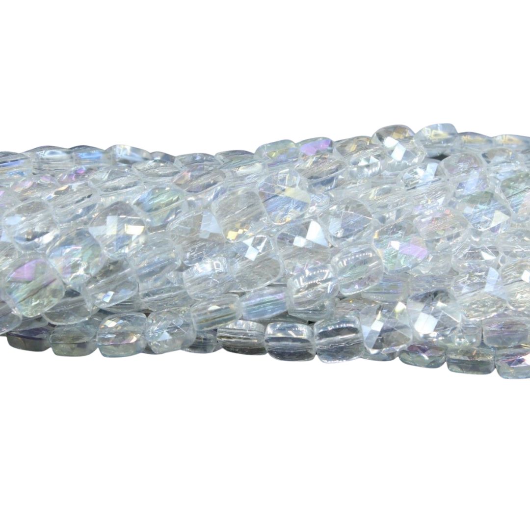 6mm Flat Faceted Square – AB – 30cm Strand. Glass Bead.