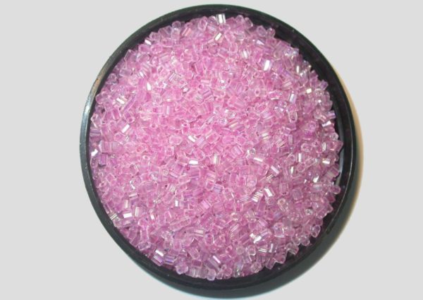 8/0 Bugle – Pink Colourlined AB – Price per gram. Hex Cut. Approx 3 x 2mm in size. Glass beads. Colourlined colours / colour lining the hole in bead. Please contact us to purchase colours not displayed.