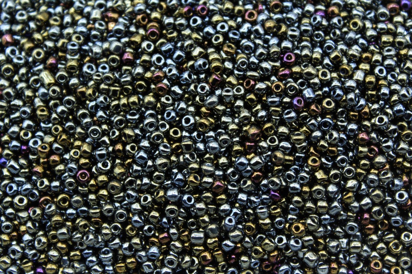8/0 – Gunmetal Oil Slick – Price per gram. Size 8/0 – approx 3mm. Glass beads. Approx 30 – 35 beads per gram.