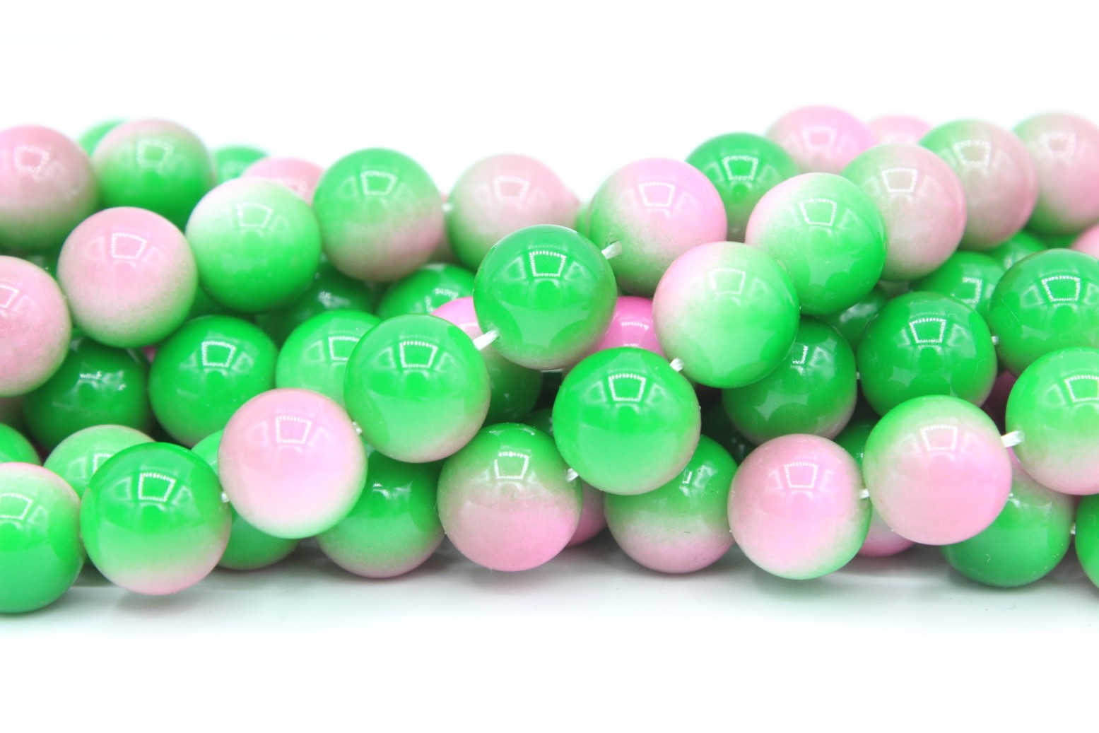 8mm Filler Bead – Pink / Green – 40cm Strand. 8mm Bead size. Glass bead. Round shape.