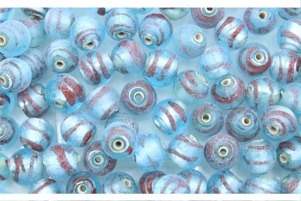 8mm Round – Foil with Stripe – Blue / Red. Glass Bead. Made in India.