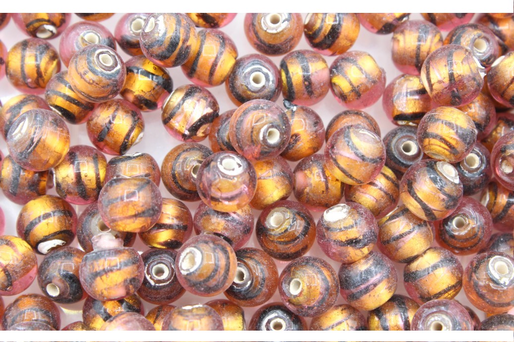8mm Round – Foil with Stripe – Brown. Glass Bead. Made in India.