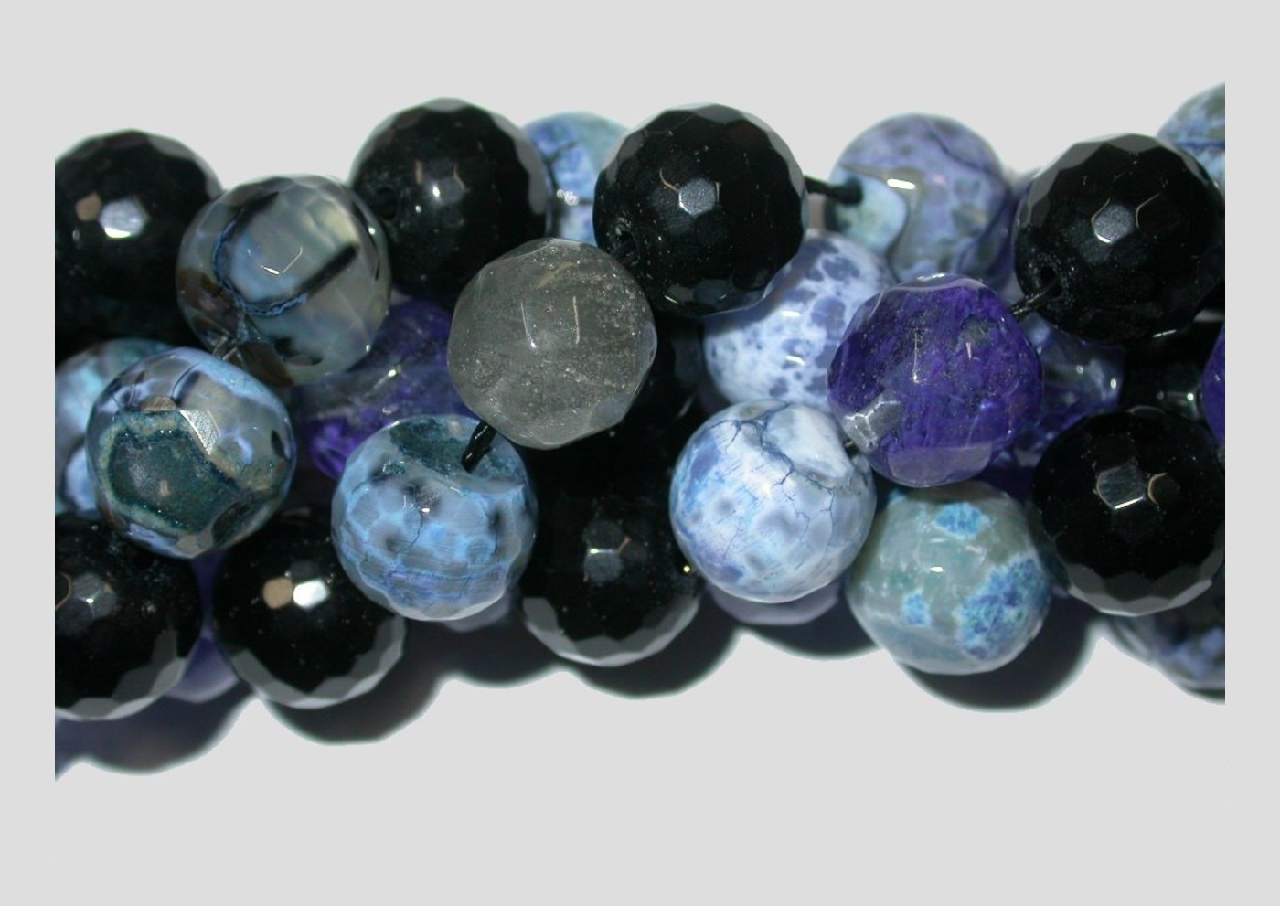 Agate – 12mm Round Faceted – Black / Blue – 36cm Strand. 12mm bead size. Please contact us to purchase individual pieces.