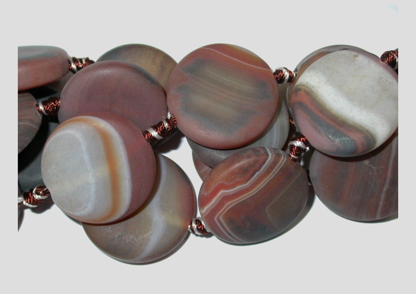 Agate – 24mm Flat Coin Shape – 34cm Strand. 24mm bead size. Please contact us to purchase individual pieces.