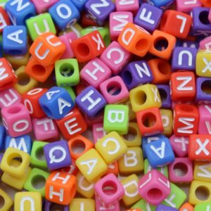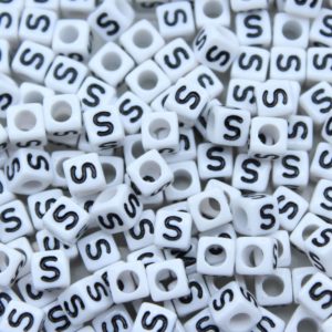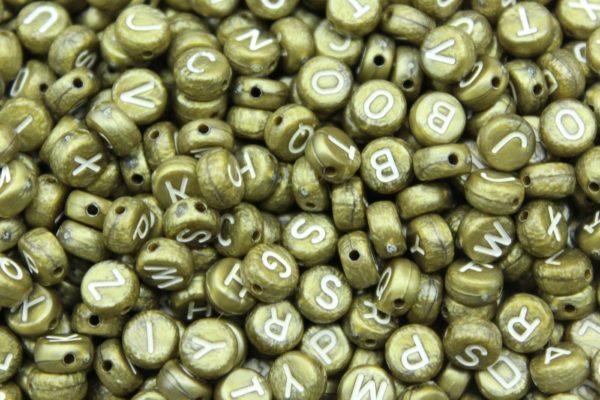 Alphabet Coin – 7mm – Olive / White Mix. Plastic bead. 7mm size. Flat Coin shape.