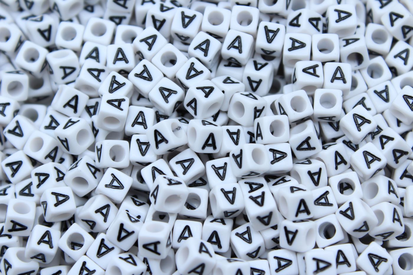 Alphabet Cube – 6mm – A – White / Black. Large hole. Plastic bead. 6mm size. Cube shape.