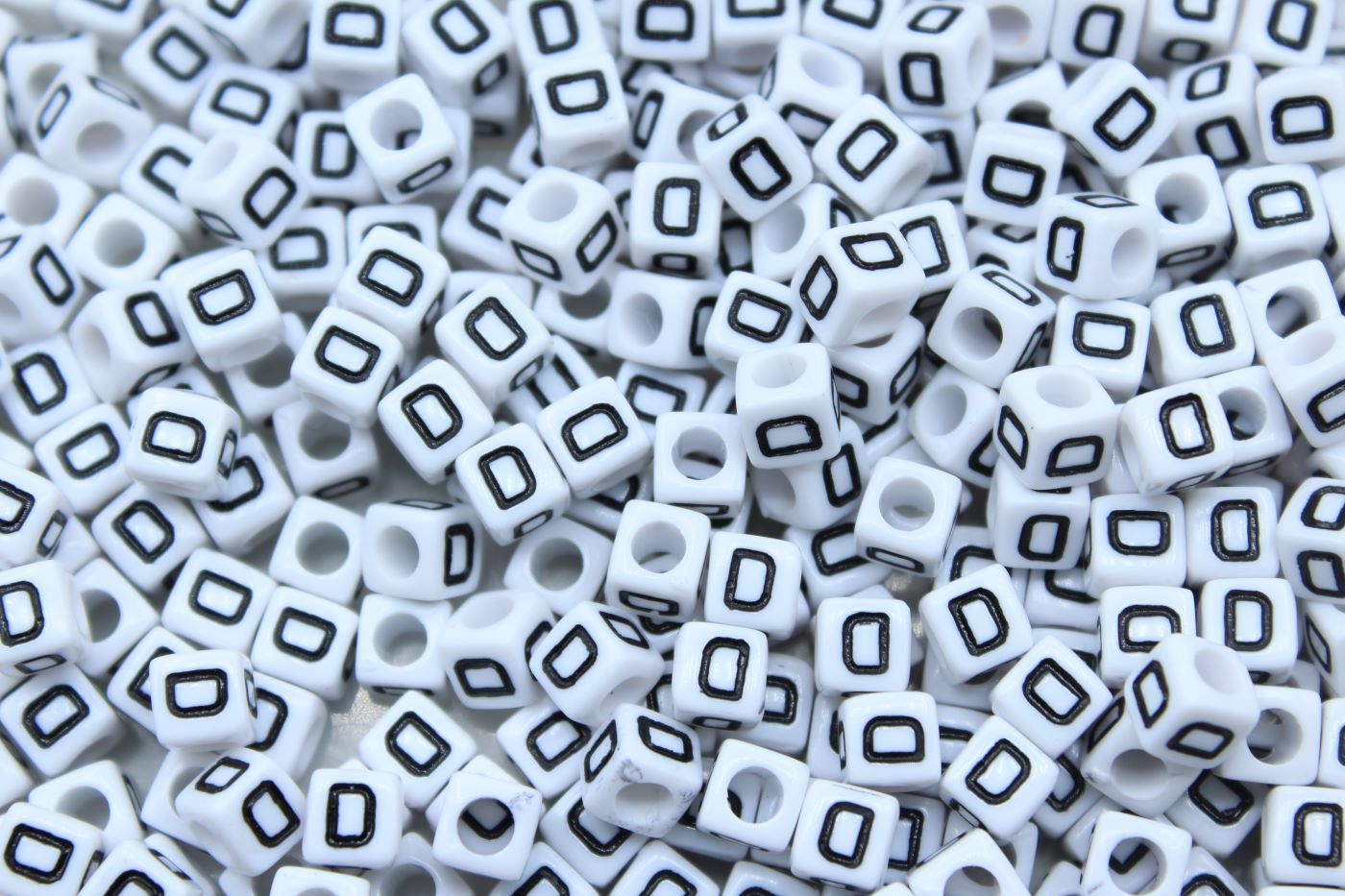 Alphabet Cube – 6mm – D – White / Black. Large hole. Plastic bead. 6mm size. Cube shape.