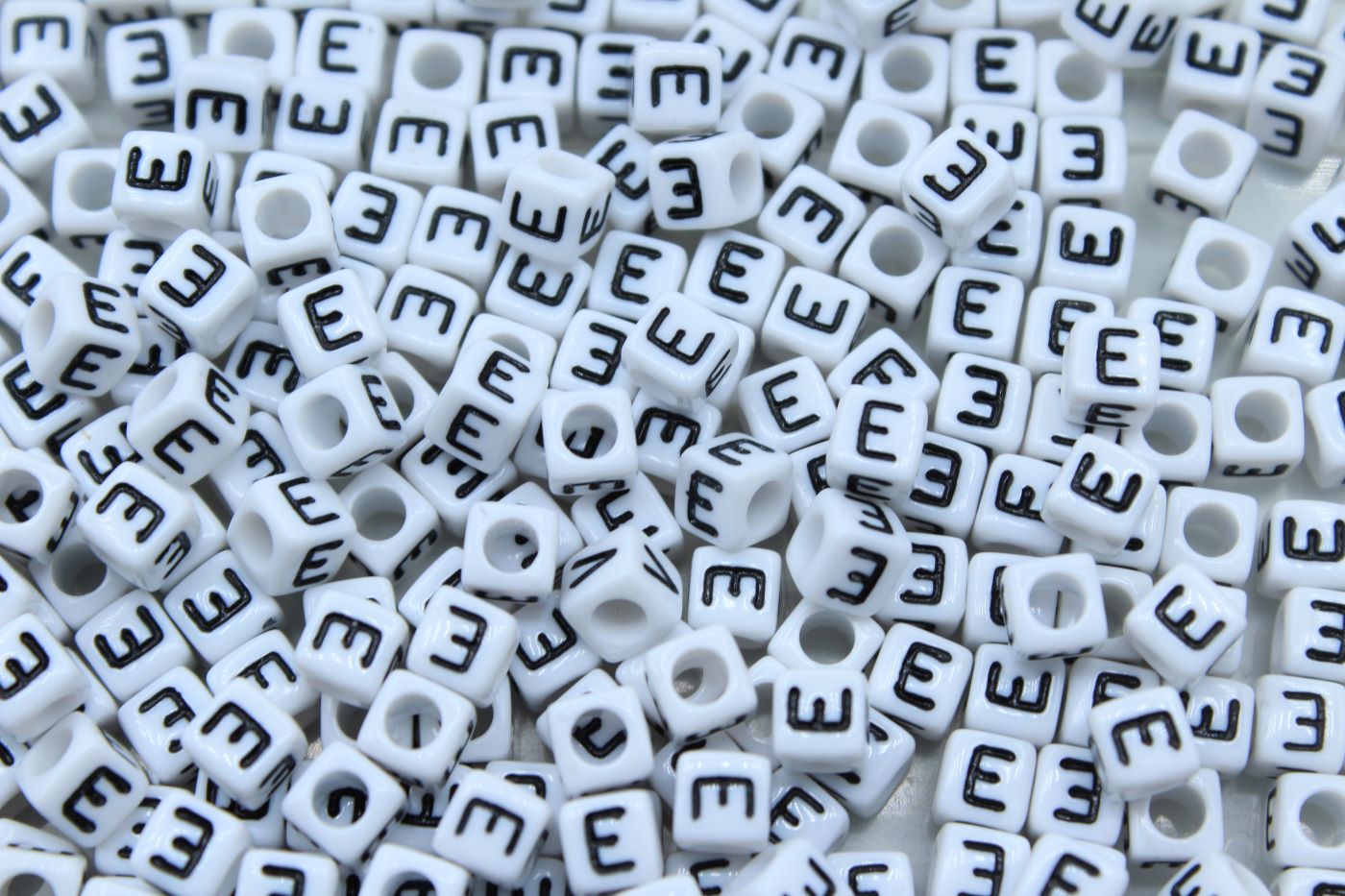 Alphabet Cube – 6mm – E – White / Black. Large hole. Plastic bead. 6mm size. Cube shape.