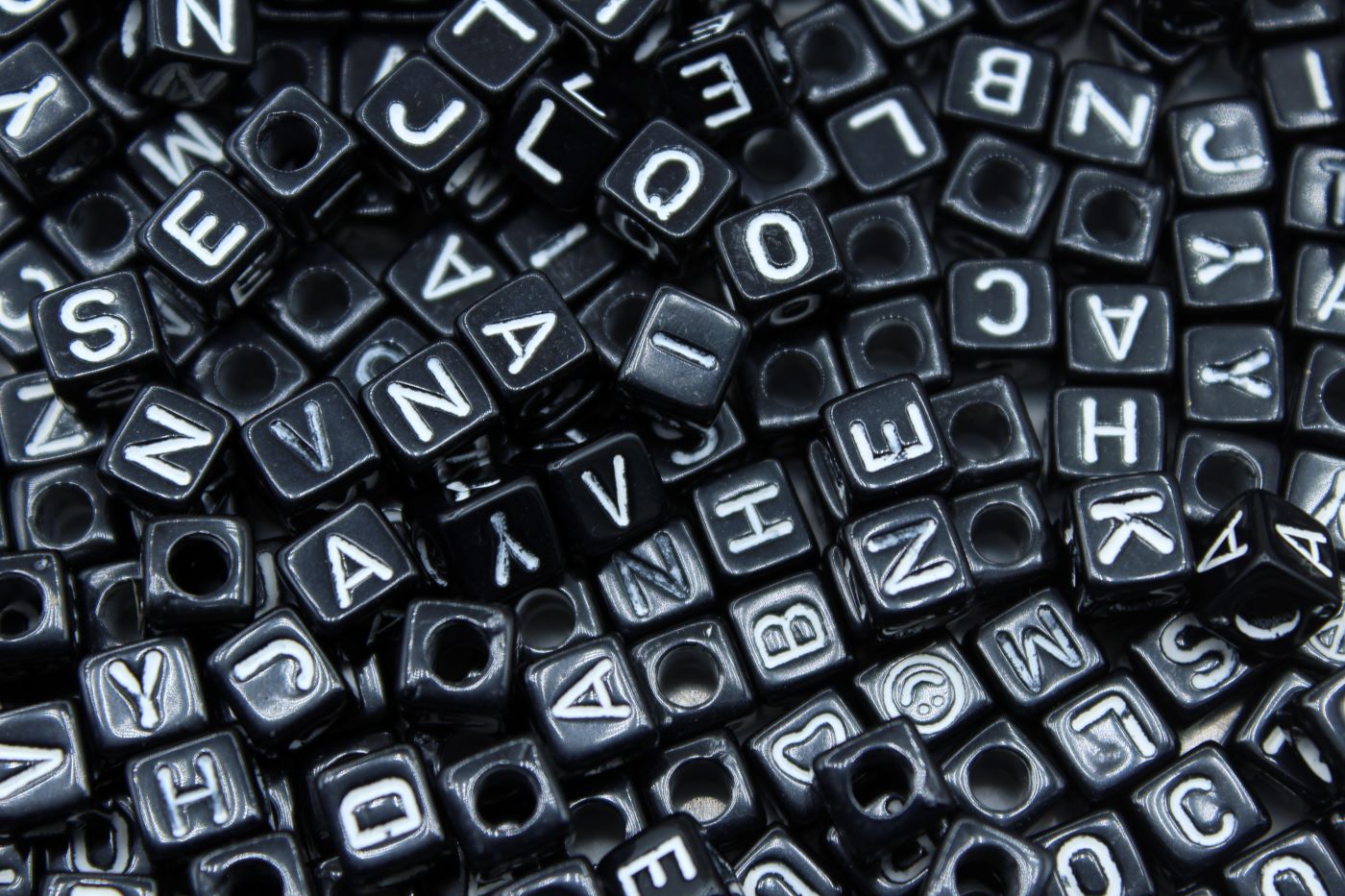 Alphabet Cube – 6mm – Mix – Black / White. Large hole. Plastic bead. 6mm size. Cube shape.