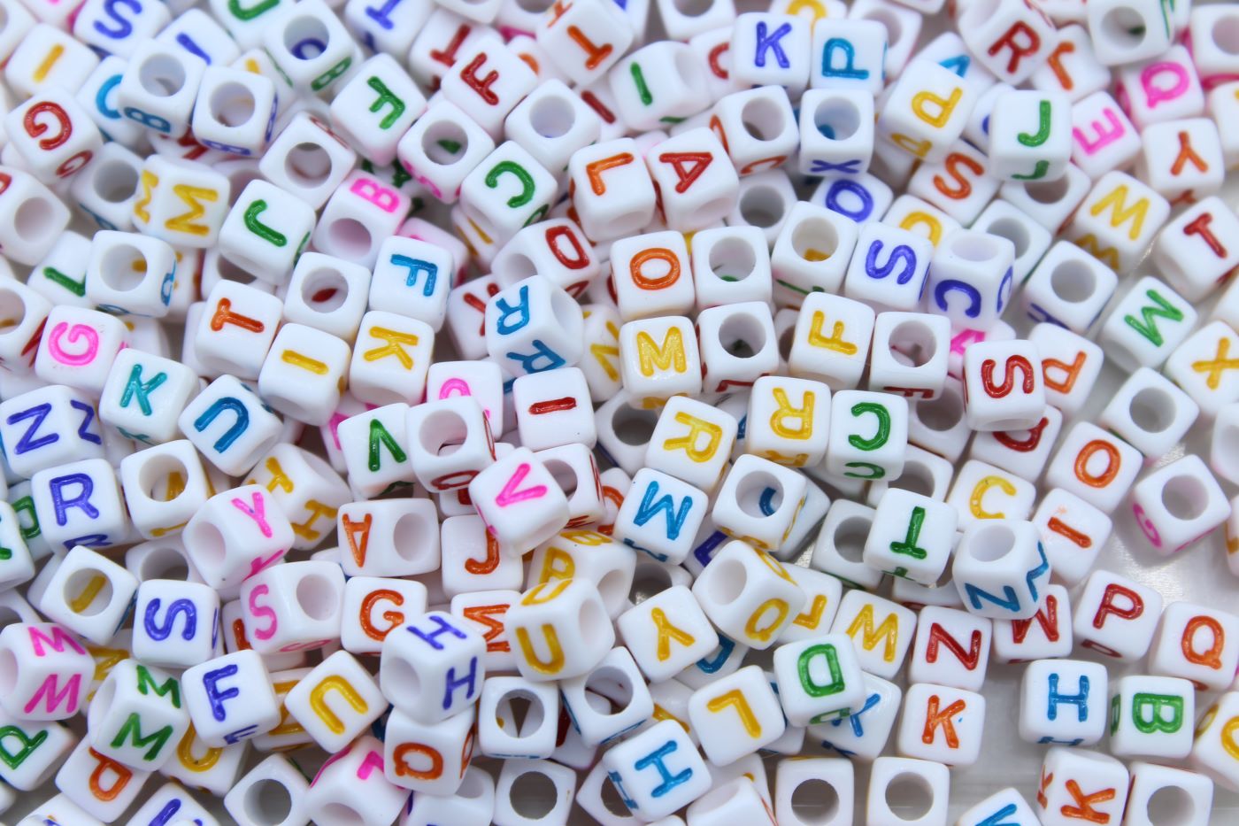Alphabet Cube – 6mm – Mix – White / Multi Colour. Large hole. Plastic bead. 6mm size. Cube shape.
