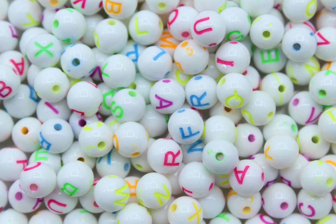 Alphabet Round – 8mm – Mix – White / Multi Colour. Plastic bead. 8mm size. Round shape.