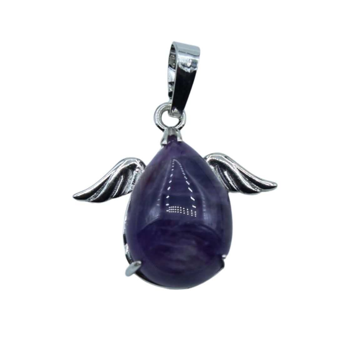Angel Pendant / Amethyst – 25mm. 25mm Angel pendant size. 16 x 11mm Cabochon Drop. Antique Silver colour pendant.