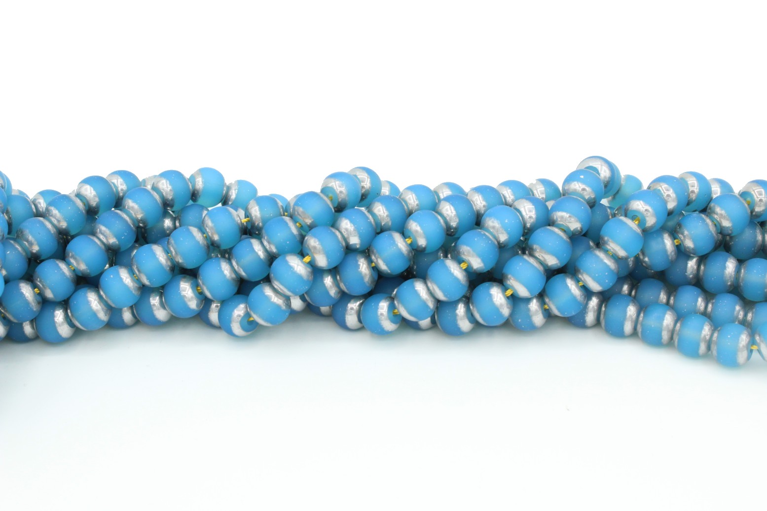 Aqua Opaque Matte / Silver – 10mm – 37cm. Glass Bead. 37cm strand. Metallic Silver capped on outside of bead.