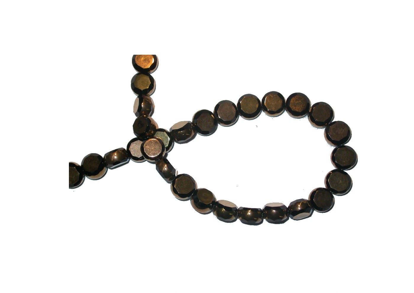 Bronze Hex Cut Flat Coin – 31cm Strand. Black Cut. Glass Bead. Please contact us to purchase individual pieces.