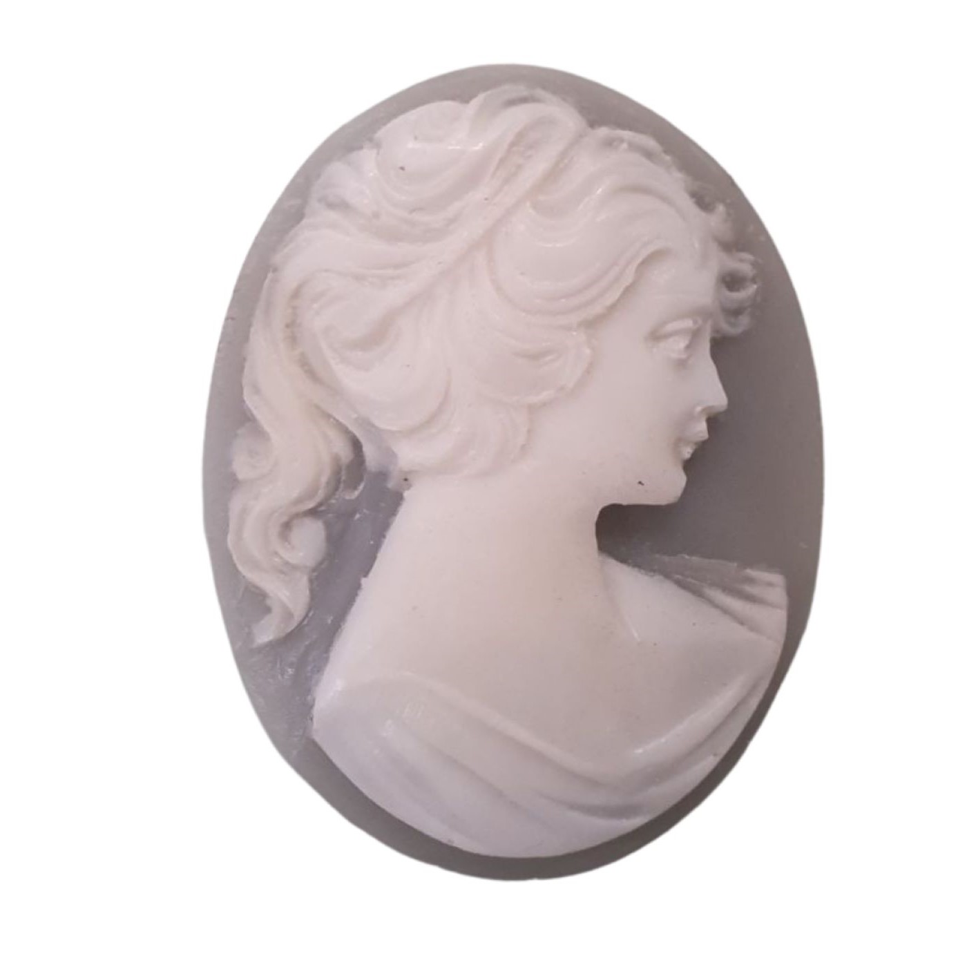 Cameo – 30 x 40mm – Oval – Wedgewood / White. Lady. High quality resin. Flat back. No Hole. Cameo can be drilled.