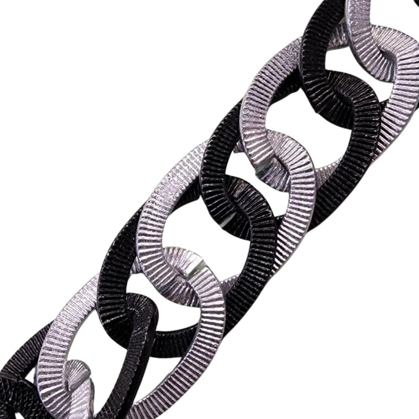 Chain – 25 x 18mm – Oval Link – Black / Silver – Price per cm. Plated. Textured Oval.