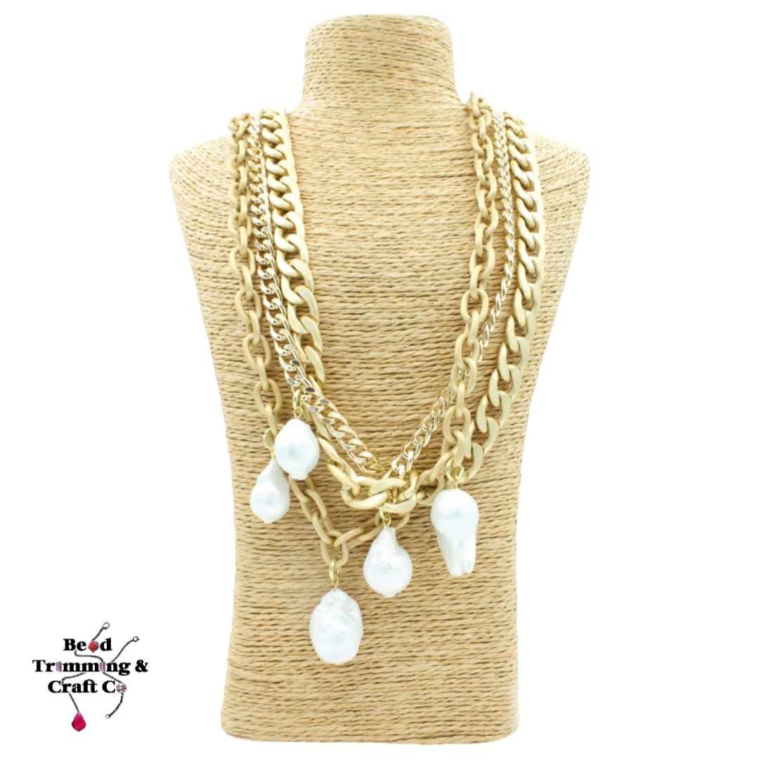 Necklace is a combination of 20 – 30mm Baroque Shell Based Pearls and chains.