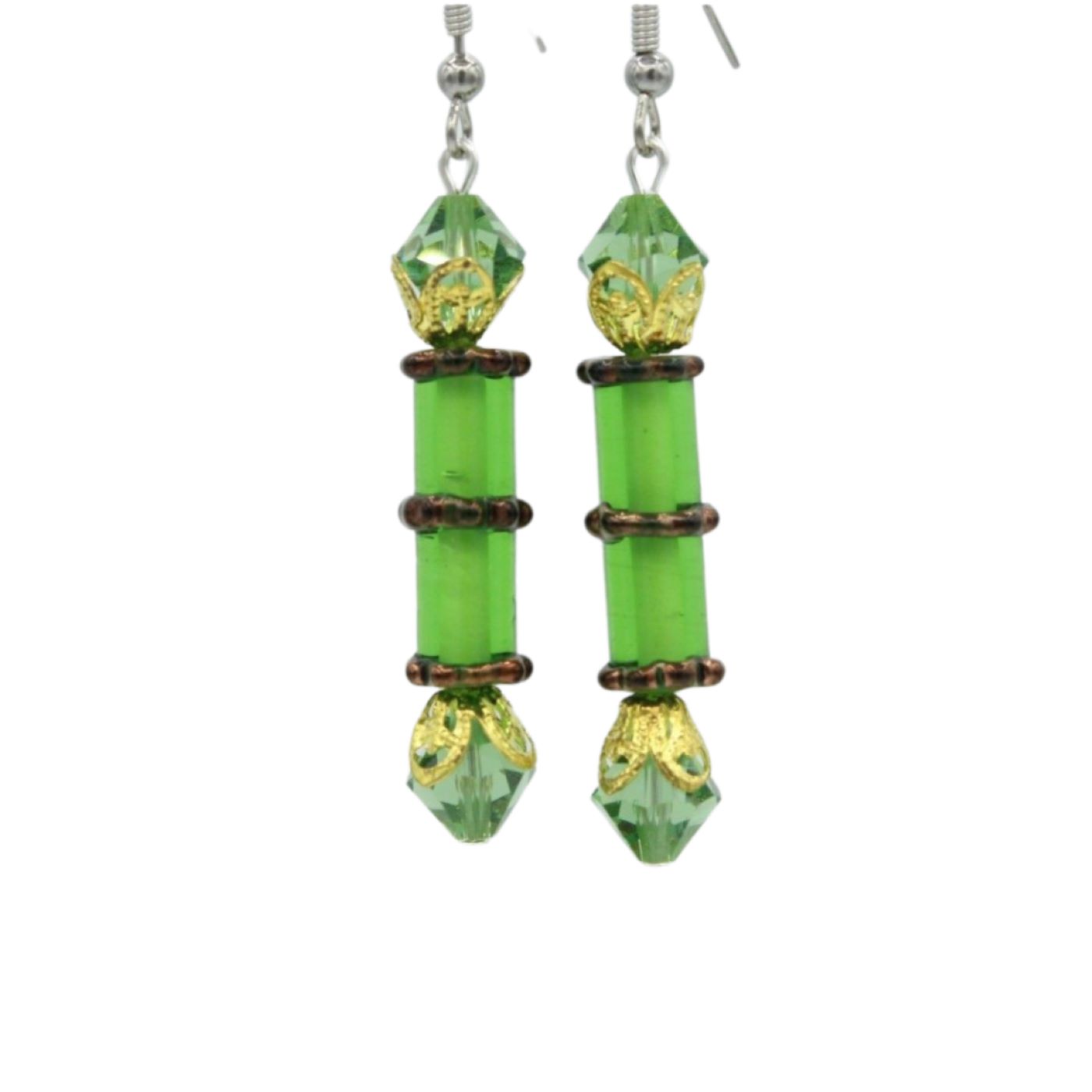 Christmas Earrings – Bon Bon – Glass / Swarovski Crystal – Emerald. Czech Made hand blown glass bead. Swarovski Crystal 8mm bicone beads. 4cm length excluding ear hook. Earrings on Stainless Steel Ear Hooks.