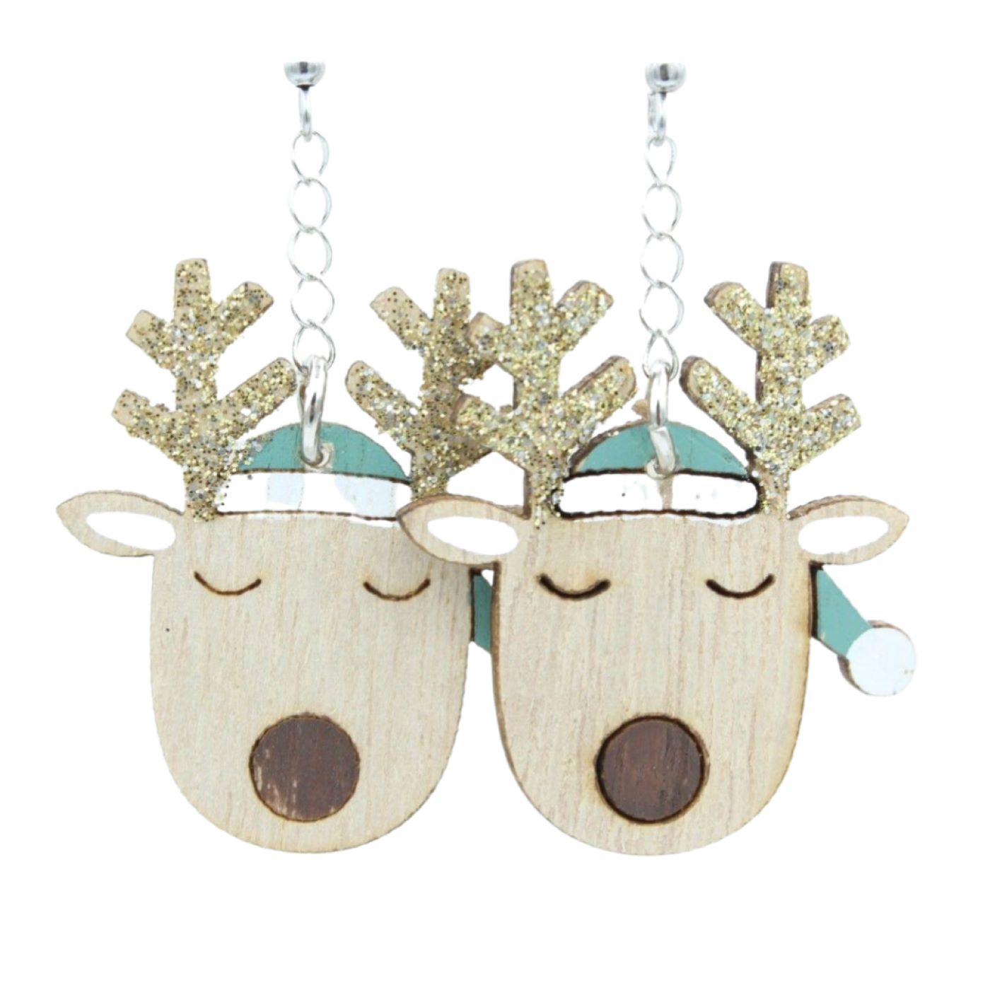 Christmas Earrings – Reindeer / Wood – Teale – 40mm