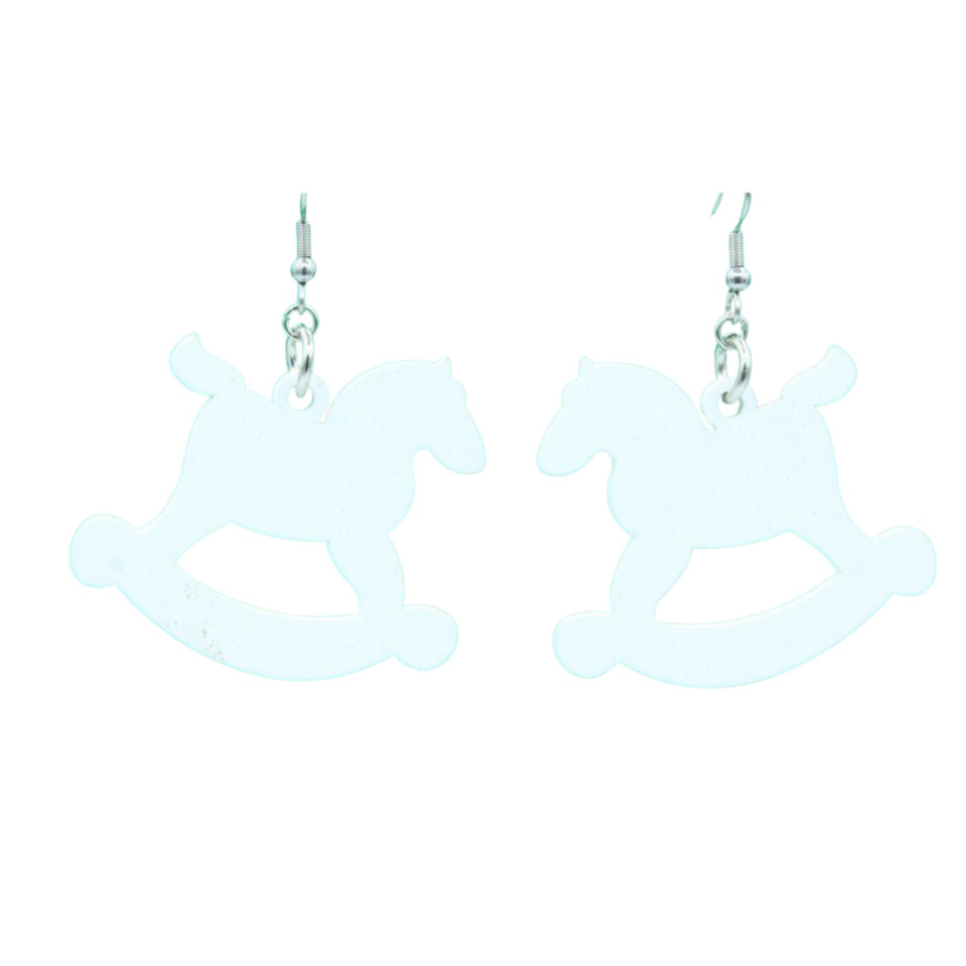Christmas Earrings – Rocking Horse – 40mm. Wood horse. 40 x 44mm length excluding ear hook. Earrings on Stainless Steel Ear Hooks.