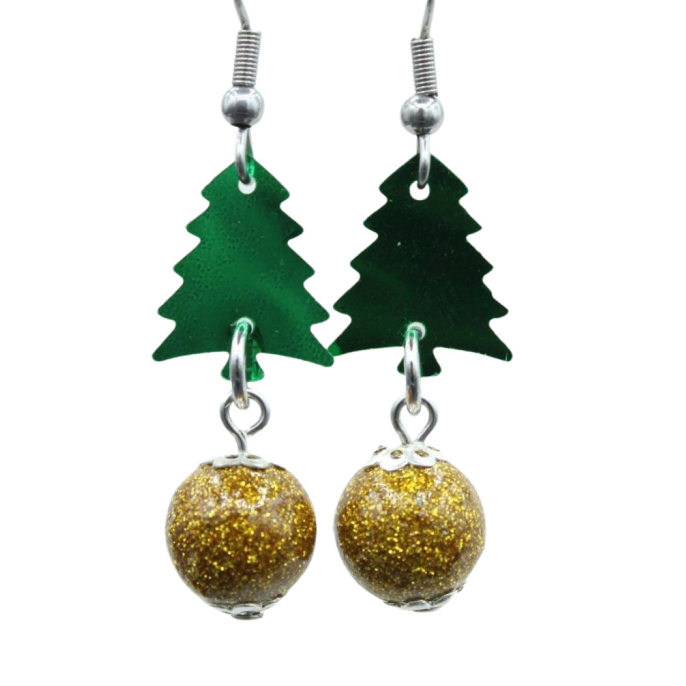 Christmas Earrings – Sequin Tree – Green / Gold – 30mm. Sequin & Quality plastic beads. 30 x 12mm length excluding ear hook. Earrings on Stainless Steel Ear Hooks. Subject to availability.