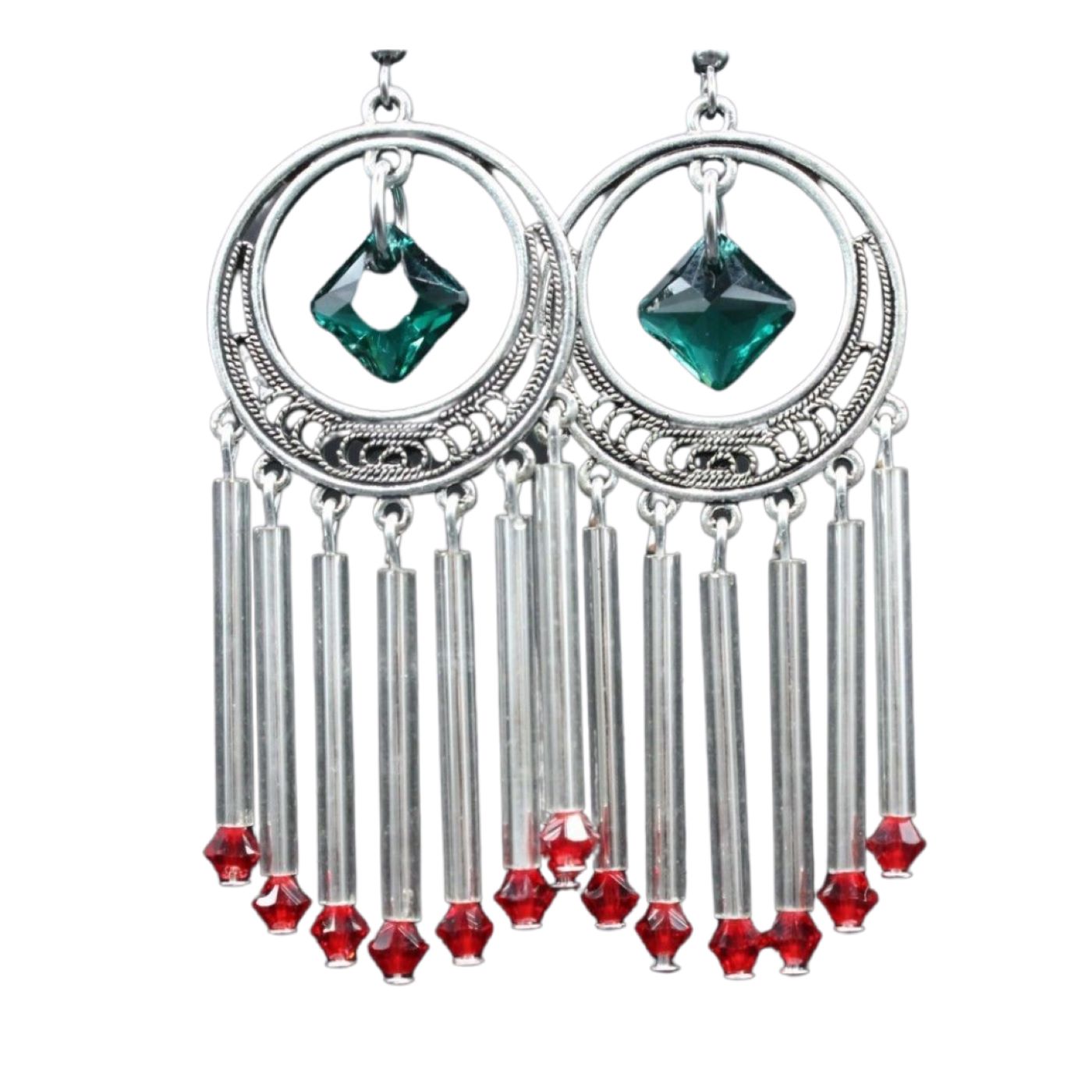 Christmas Tassel Earring – Silver. Swarovski Crystal Emerald Princess pendants and Light Siam Bicones. 30mm Clear silverlined glass bugle beads. 60mm drop excluding ear hook. Earrings on Stainless Steel Ear Hooks.