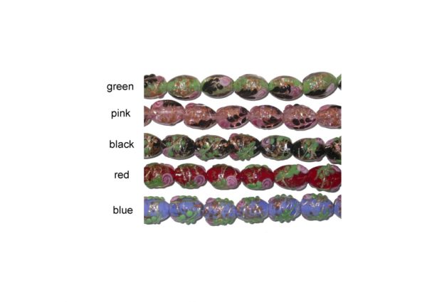 15 x 12mm Colourlined Oval With Gold Foil Stripe & Flower Print. Glass bead. Good Quality. Please contact us to purchase individual pieces.