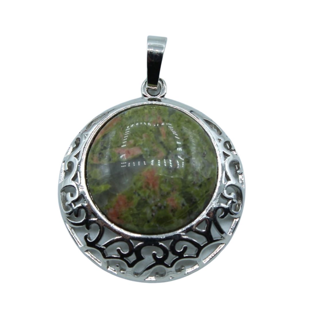 Crescent Pendant / Unakite – 30mm.  30mm Crescent pendant size. 20mm Cabochon.  Antique Silver colour pendant.
