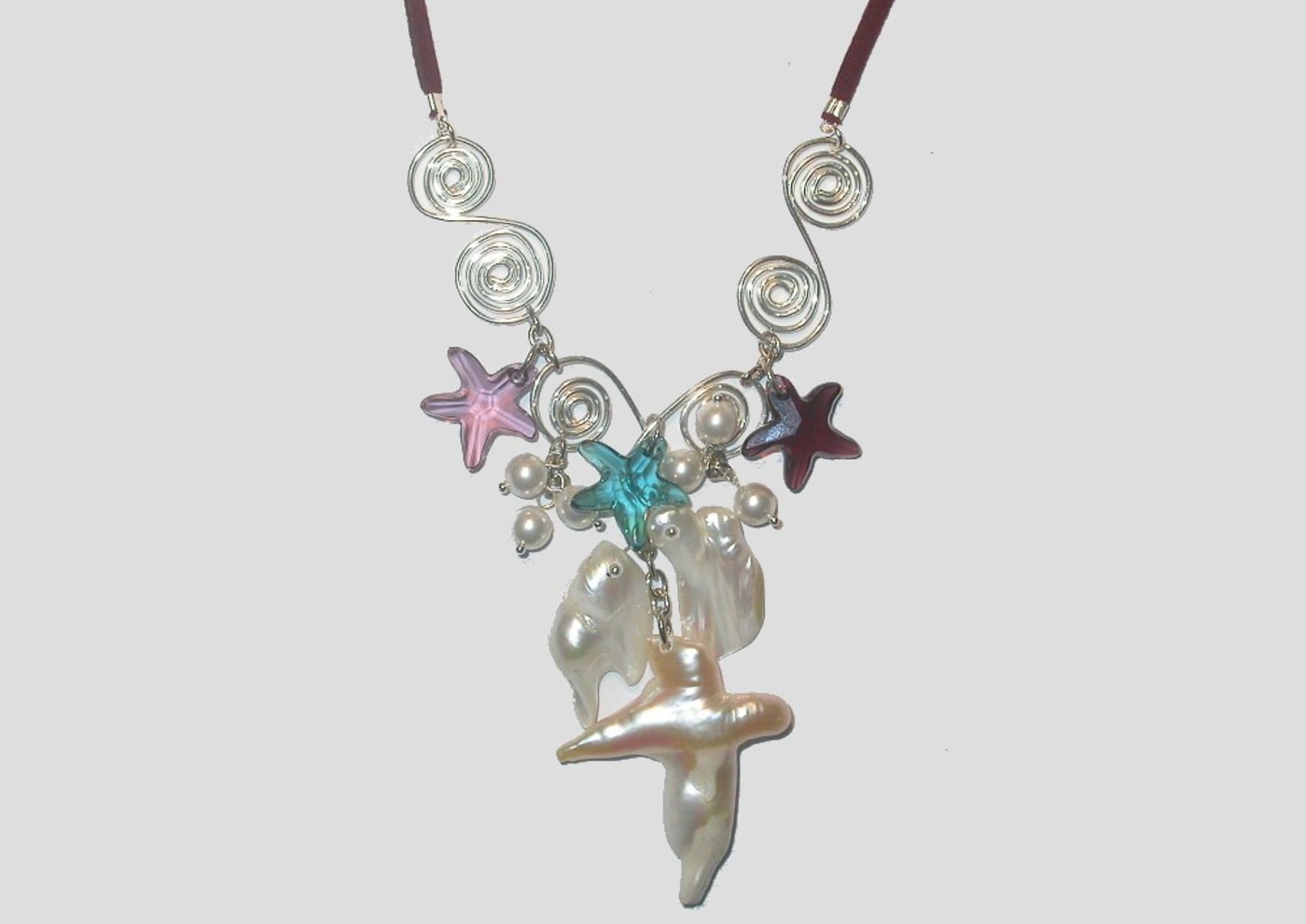 Crystal / Freshwater Sea Necklace. Necklace has a combination of Swarovski crystal starfish, crystal pearls, non tarnish wire, freshwater pearls and suede.