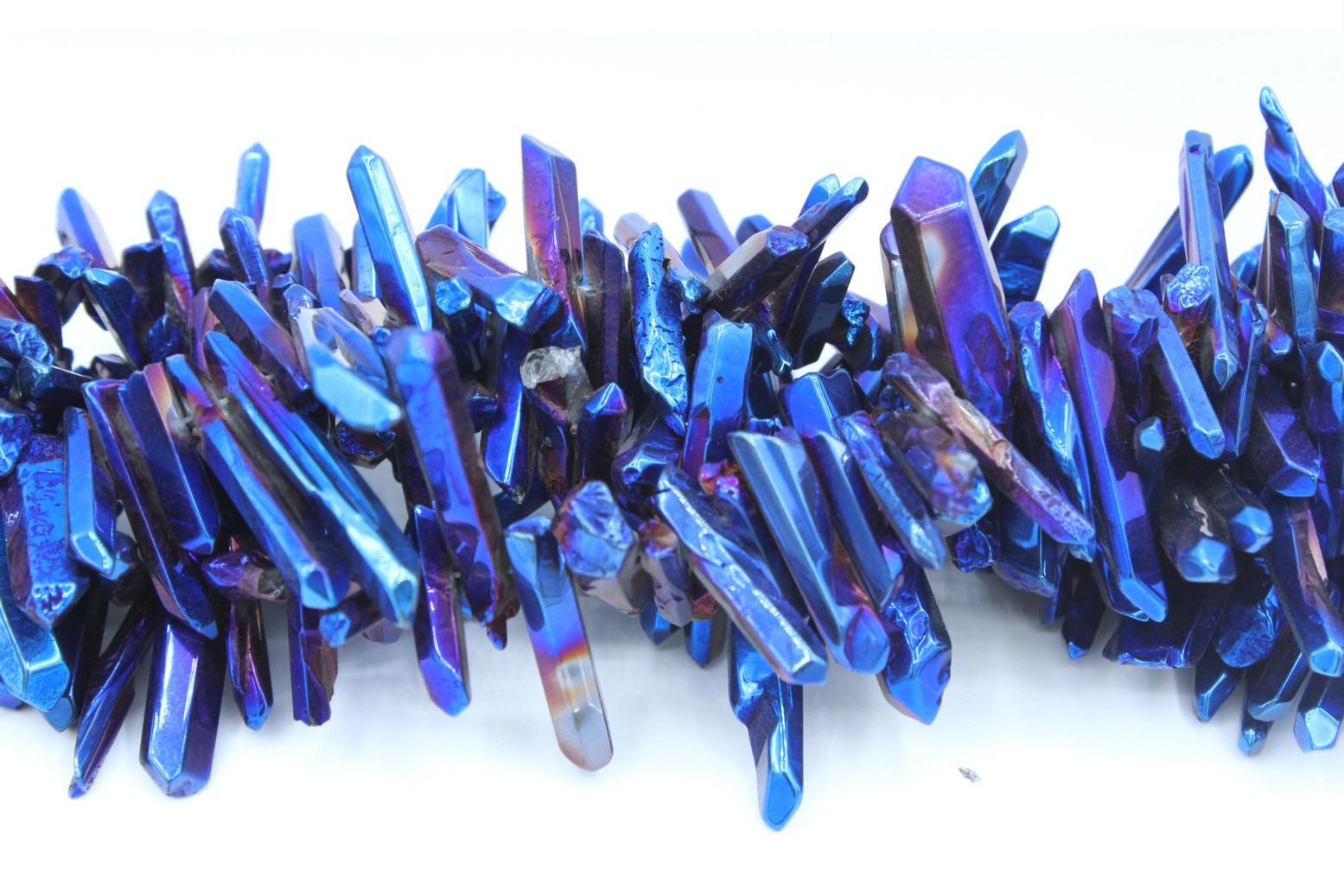 Crystal Icicle – 15-20mm – Electroplated Blue Iris – 38cm Strand. Approx 15 to 30mm bead size. Side drilled. Natural Crystal core.