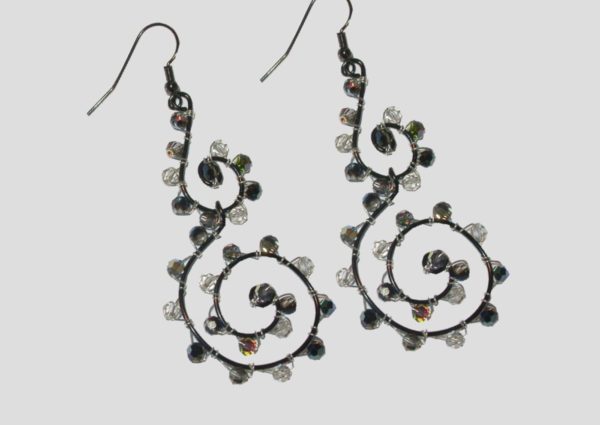 Crystal Scroll Earrings. Earring consists of gauged wire then decorated using the multi facet 5000 series Swarovski crystal. Large variety of colours available. Please contact us to order colours not displayed.