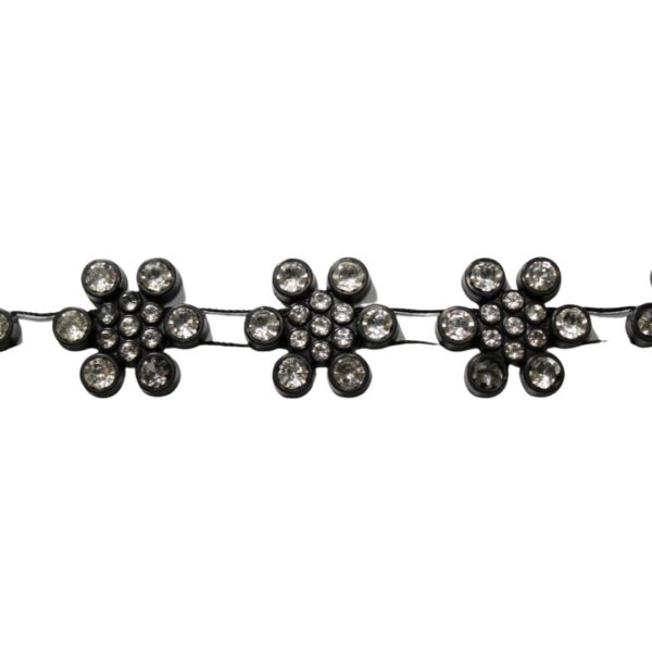 Crystal Trim – Flower – Black / Crystal – Price per cm. 16mm Width. Black plastic backing with Clear crystals. Price is per centimetre.