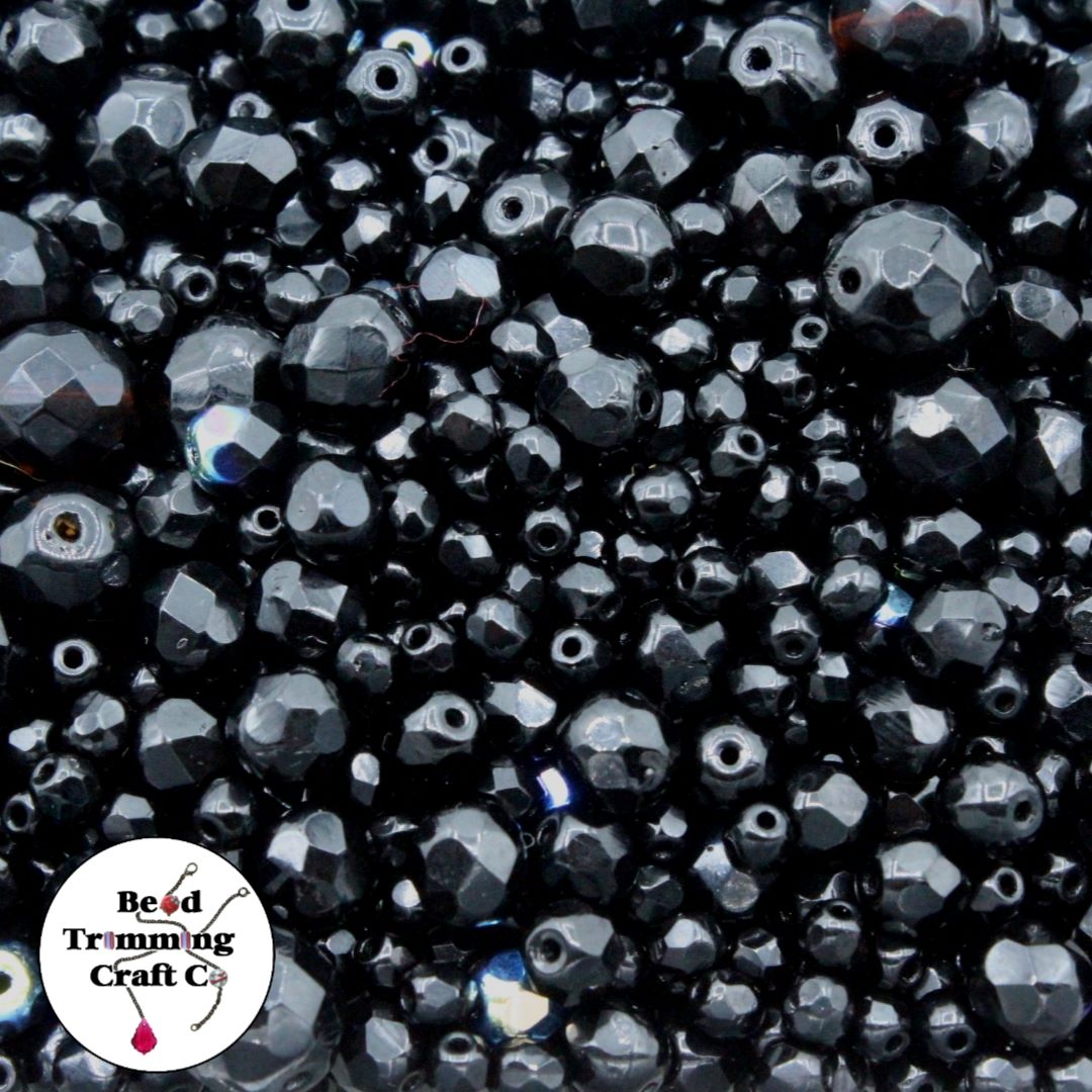 Czech Fire Polished Faceted Glass Bead Mix – 4 to 10mm – 50 grams – Black.