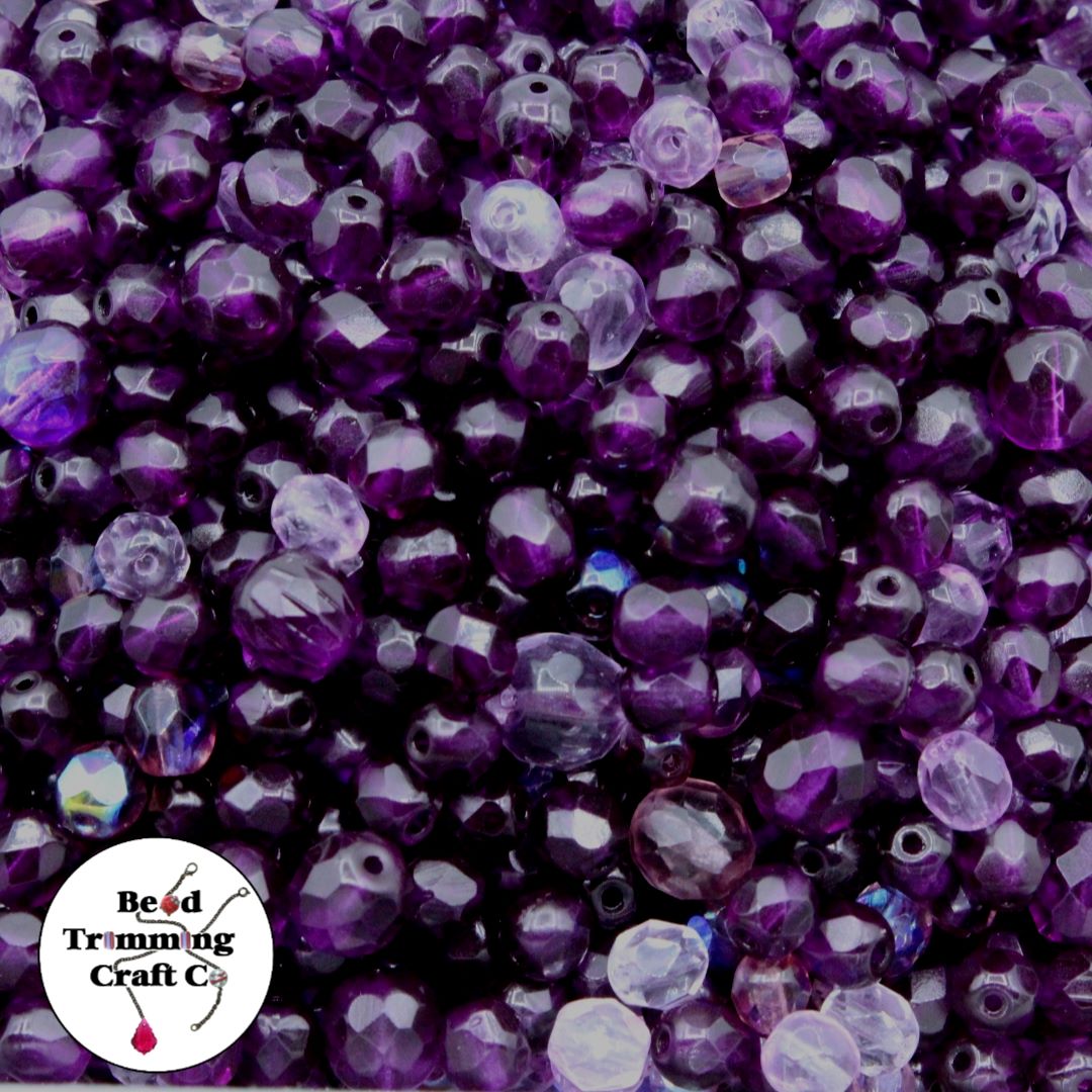 Czech Fire Polished Faceted Glass Bead Mix – 6 to 10mm – 50 grams – Purple.