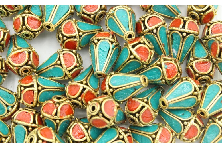 Drop – 18 x 12mm – Antique Gold / Red / Teale. Quality product. Metal Bead. Plated.