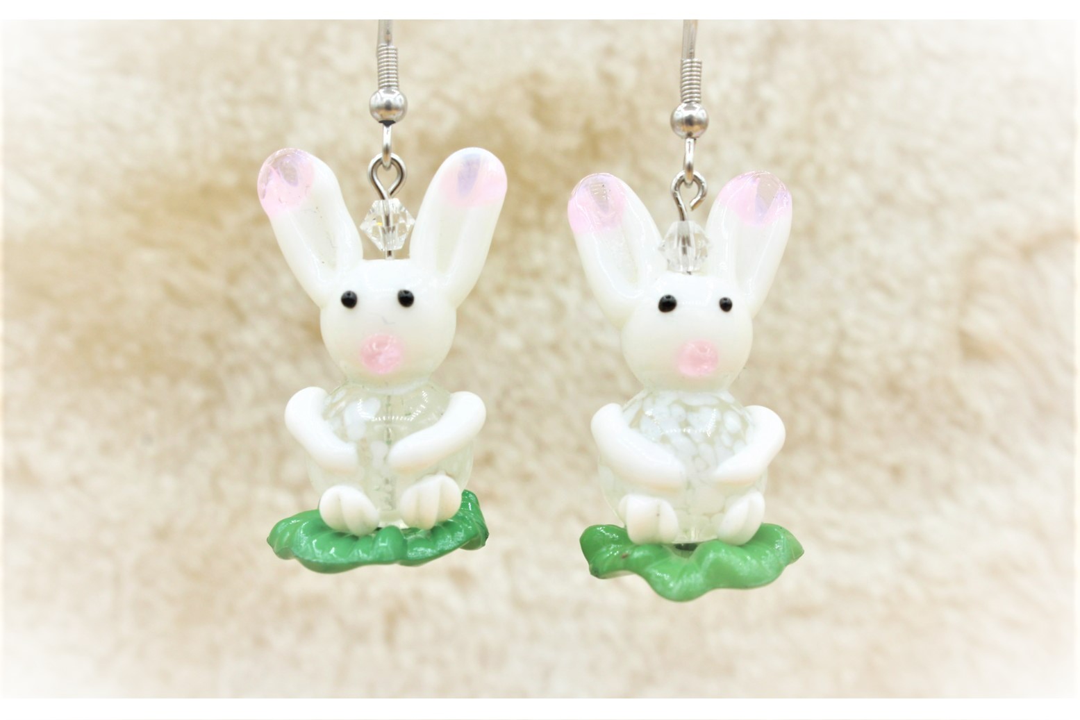 Easter Bunny Earrings – 30 x 18mm. Quality Hand Made glass Bunny. Bunny sitting on plastic base. Size does not include earring components. Earrings on Stainless Steel Ear Hooks.